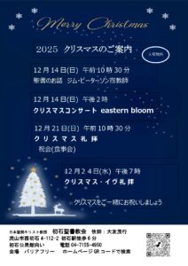 | 主日礼拝 | 毎週日曜日 10:30〜11:30 |